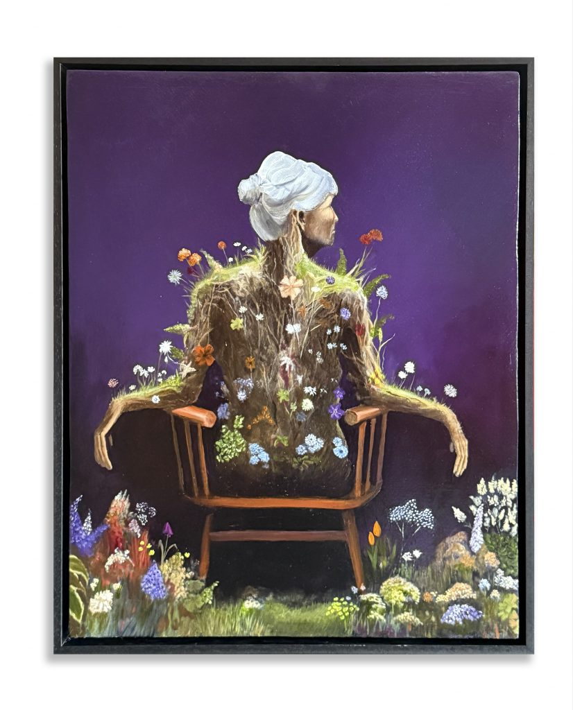 The work shows an elderly woman seated among blooming flowers, her body rooted—literally and figuratively—into the ground beneath her. She embodies continuity, both fragile and enduring, as though she is the soil from which new life grows